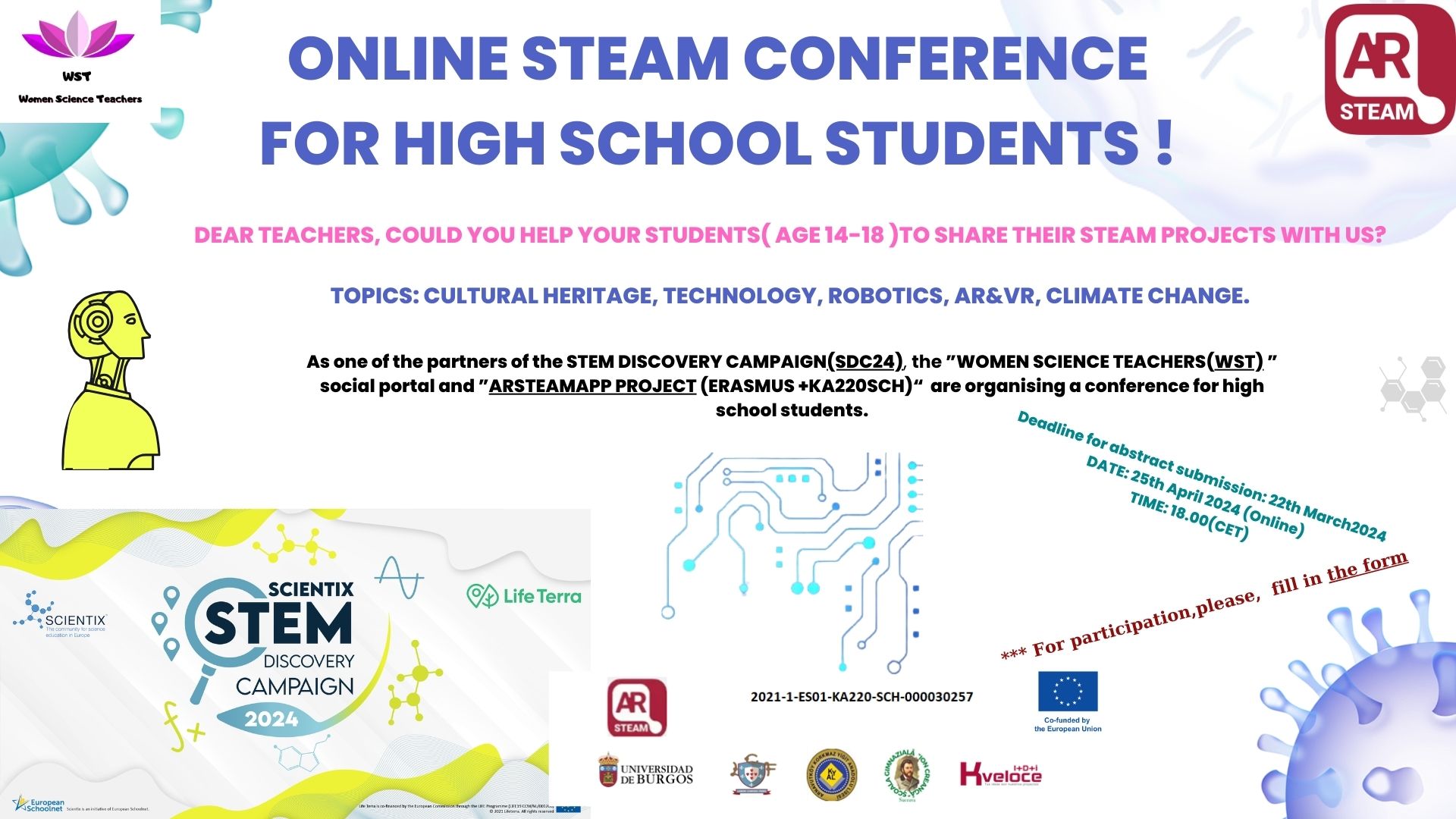 As one of the partner organisations of STEM Discovery Campaign24 held by European Schoolnet (SDC24), ARSTEAMapp Project (Erasmus+KA220SCH) is organising an Online STEAM Conference for all students(14-18 age). For participation :